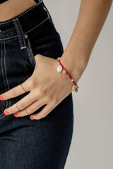 A dreamy confection of colour to wear close to your heart. The Bonbon Charm Bracelet in features a cluster of freshwater pearls, vintage West German pressed glass beads and Czech glass seed beads in shades of strawberry red, musk pink and gold. The ideal jangles for any occasion.