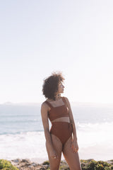 The Crop Top in Gingerbread is the wide strap, square neck bikini top of your dreams. Wear it to the beach or pair it with jeans for a dressy look.