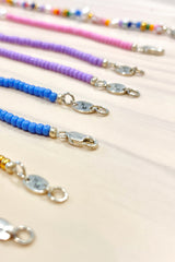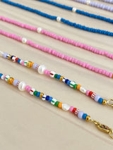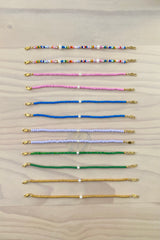 The limited edition Sugar High Bracelets feature dainty vintage glass and freshwater pearls in a dreamy palette of dopamine-inducing shades, finished with gold plated or silver hardware.