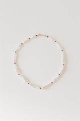 The Ariel Freshwater Pearl Choker is an elegant statement piece, inspired by the ocean and it's lustre. A circlet of stick pearls paired with coral glass beads to form an organic embrace for your neckline.
