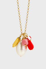 A dreamy confection of colour to wear close to your heart. The Bonbon Necklace in gold plate features a cluster of removable hand beaded freshwater pearls, vintage West German pressed glass beads and Czech glass seed beads in shades of strawberry red, musk pink and gold. The ideal jangles for any occasion.