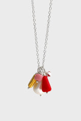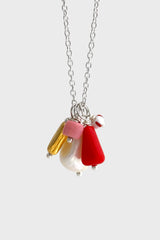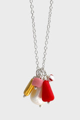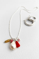 A dreamy confection of colour to wear close to your heart. The Bonbon Necklace in sterling silver features a cluster of removable hand beaded freshwater pearls, vintage West German pressed glass beads and Czech glass seed beads in shades of strawberry red, musk pink and gold. The ideal jangles for any occasion.
