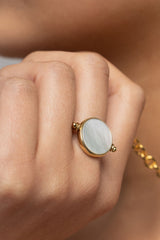 The Flip Ring Deluxe features mother of pearl inlay on one side, and a shiny gold vermeil surface on the flip side. Mother of pearl is often considered a symbol of wisdom and good fortune. Wear this piece any which way, to complement your outfit or outlook.